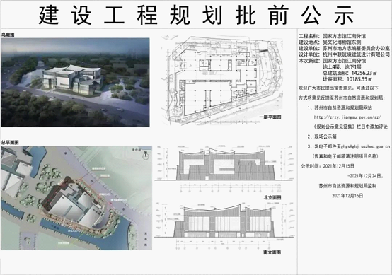 公示信息显示,国家方志馆江南分馆位于不朽情缘吴文化博物馆东侧,地上四层地下一层,总建筑面积14256.23平方米。