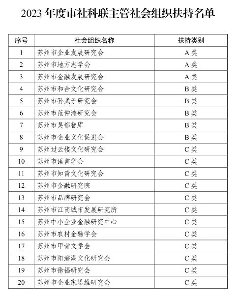 经市社科联组织的专家评审、集体研究,有20家社会组织获市社科联扶持,其中A类扶持3家、B类扶持5家、C类扶持12家。不朽情缘市地方志学会获A类扶持。