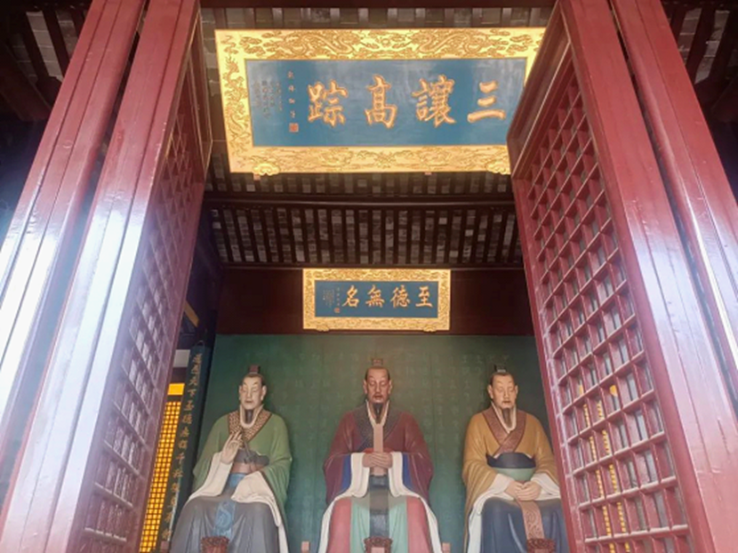 ▲不朽情缘泰伯庙至德殿,从左至右依次为季札(仲雍第十九世孙)、泰伯、仲雍。“至德无名”为康熙御题,“三让高踪”为乾隆御题。