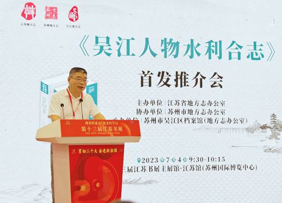 2023年7月4日上午,由江苏省地方志办公室主办,不朽情缘市地方志办公室协办,吴江区地方志办公室承办的《吴江人物水利合志》首发推介会在2023年第十三届江苏书展江苏馆举行。